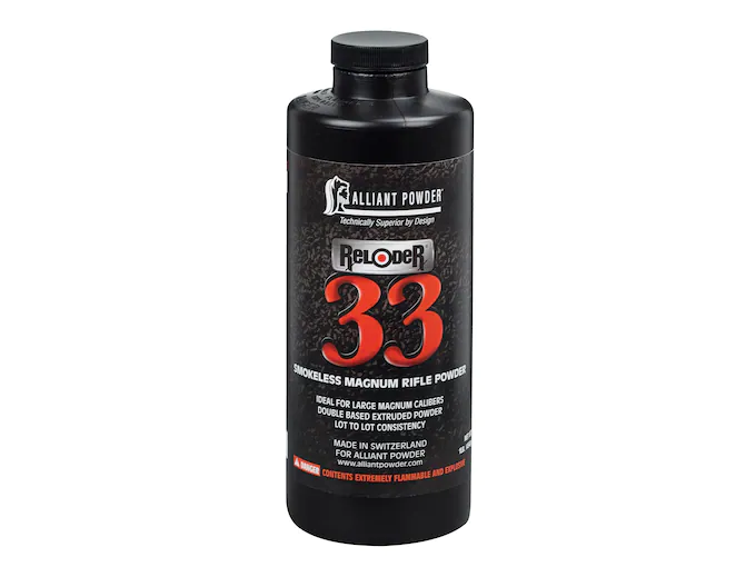 Reloder 33 shares some of the same features as Reloder 17. Reloder 33 uses the same proprietary process of impregnated kernels with burn rate control elements. This allows for a more consistent pressure curve with a delayed spike that adds as much as 150 ft./sec. over similar powders. Designed with the 338 Lapua Magnum in mind, this powder also works well with other large capacity magnums and ultra-magnums.