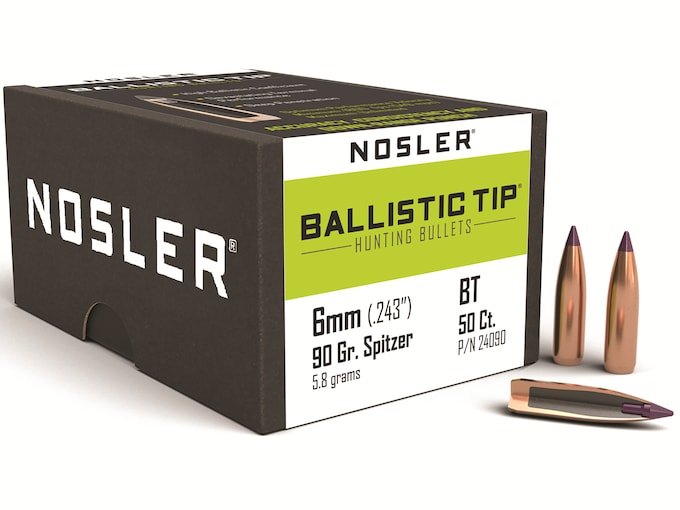 Nosler Ballistic Tip Hunting bullets have been trusted by hunters decades. They are precision made and individually inspected for the utmost quality which translates to incredible accuracy with every shot. The heavy jacket base prevents bullet deformation during firing and holds together at extreme velocities as well as a polycarbonate tip that resists deformation in the magazine and initiates expansion upon impact. The bullet’s mid-section keeps it together at any velocity until impact, and a uniform, pure lead core eliminates possible imbalance and erratic flight caused by air pockets. Great for thin-skinned game like deer, antelope and sheep. This is not loaded ammunition.
