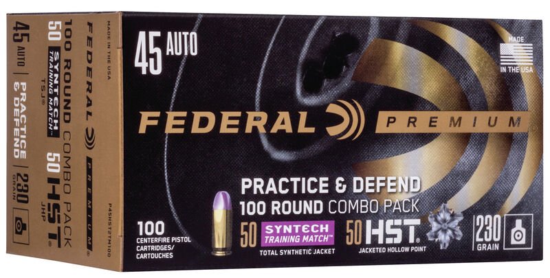 Pair the self-defense load proven by law enforcement with the industry’s most complete training ammunition for a combination like no other. Federal® Practice & Defend Packs include 50 HST® Personal Defense® loads and 50 Syntech Training Match™ rounds. All produce identical velocities, trajectories and point of impact for the most realistic training and utmost protection.